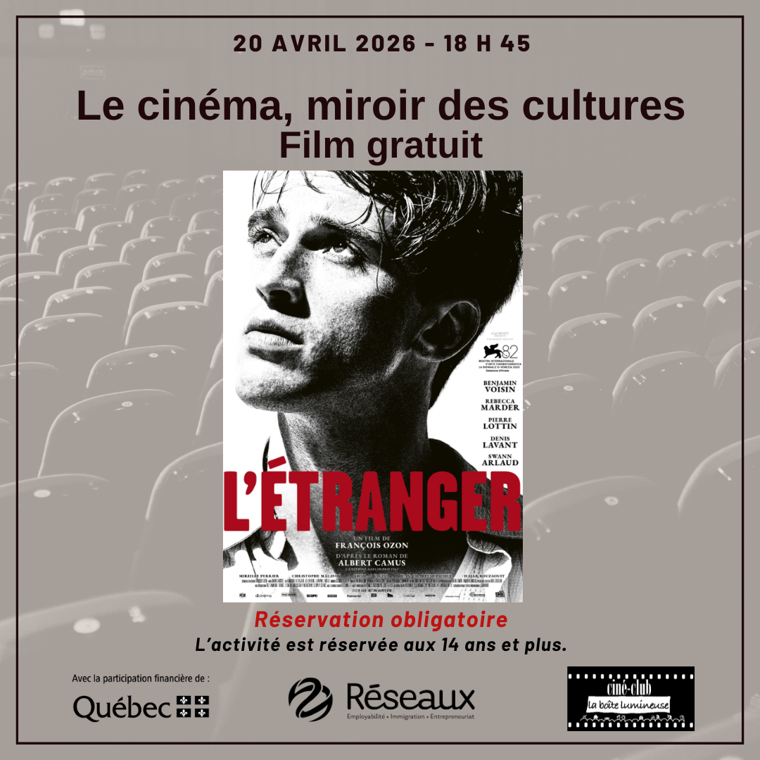 Cette activité fait partie de notre série : Le cinéma, miroir des cultures. Vous aurez l’occasion de venir voir la projection d’un film présenté par le Ciné-Club La Boîte Lumineuse. Cette activité s’adresse aux personnes immigrantes et la projection est offerte gratuitement par Réseaux.